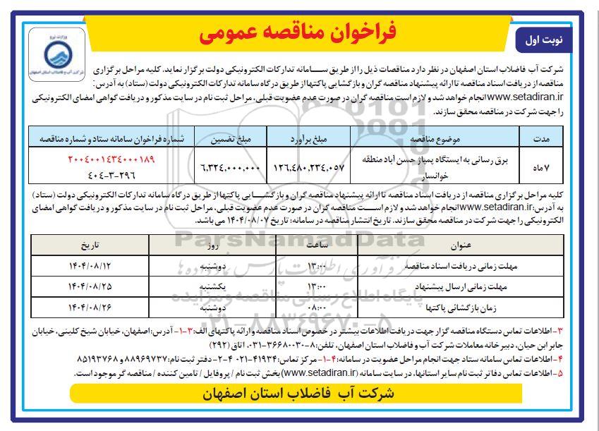 | 7 ماه | برق رسانی به ایستگاه پمپاژ حسن آباد منطقه خوانسار | 126.480.234.057 | 6.324.000.000 | 2004001434000189 404-3-296 |