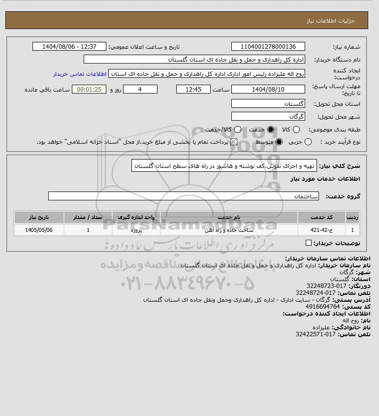 شرح کلی نیاز: تهیه و اجرای نقوش،کف نوشته و هاشور در راه های سطح استان گلستان