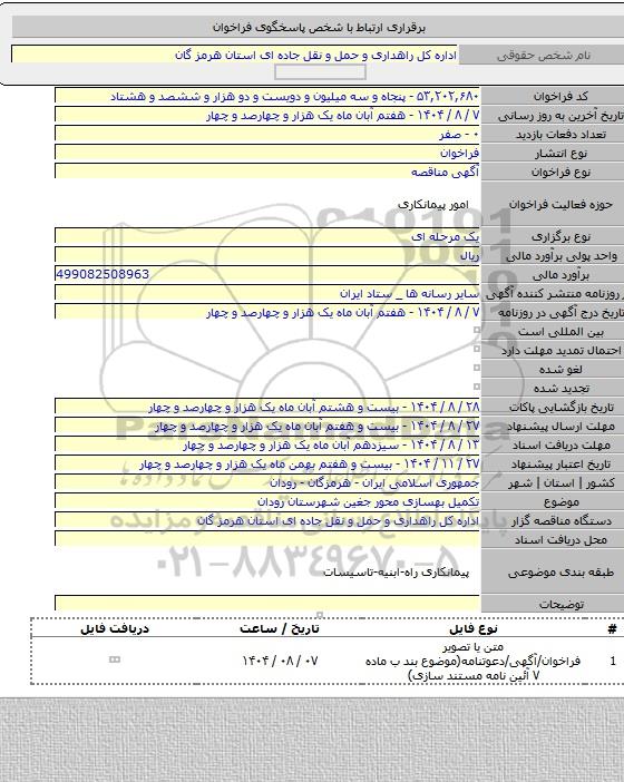 مناقصه تکمیل بهسازی محور جغین شهرستان رودان از کلیه افراد متخصص و شرکتها واجد شرایط دعوت به عمل میآید در مناقصه با کد خبرگزاری پارس نماد: 9766160 شرکت نمایند.