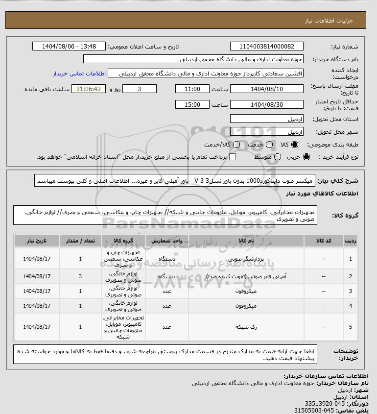 | 3 | -- | میکروفون | عدد | لوازم خانگی، صوتی و تصویری | 1 | 1404/08/17 |