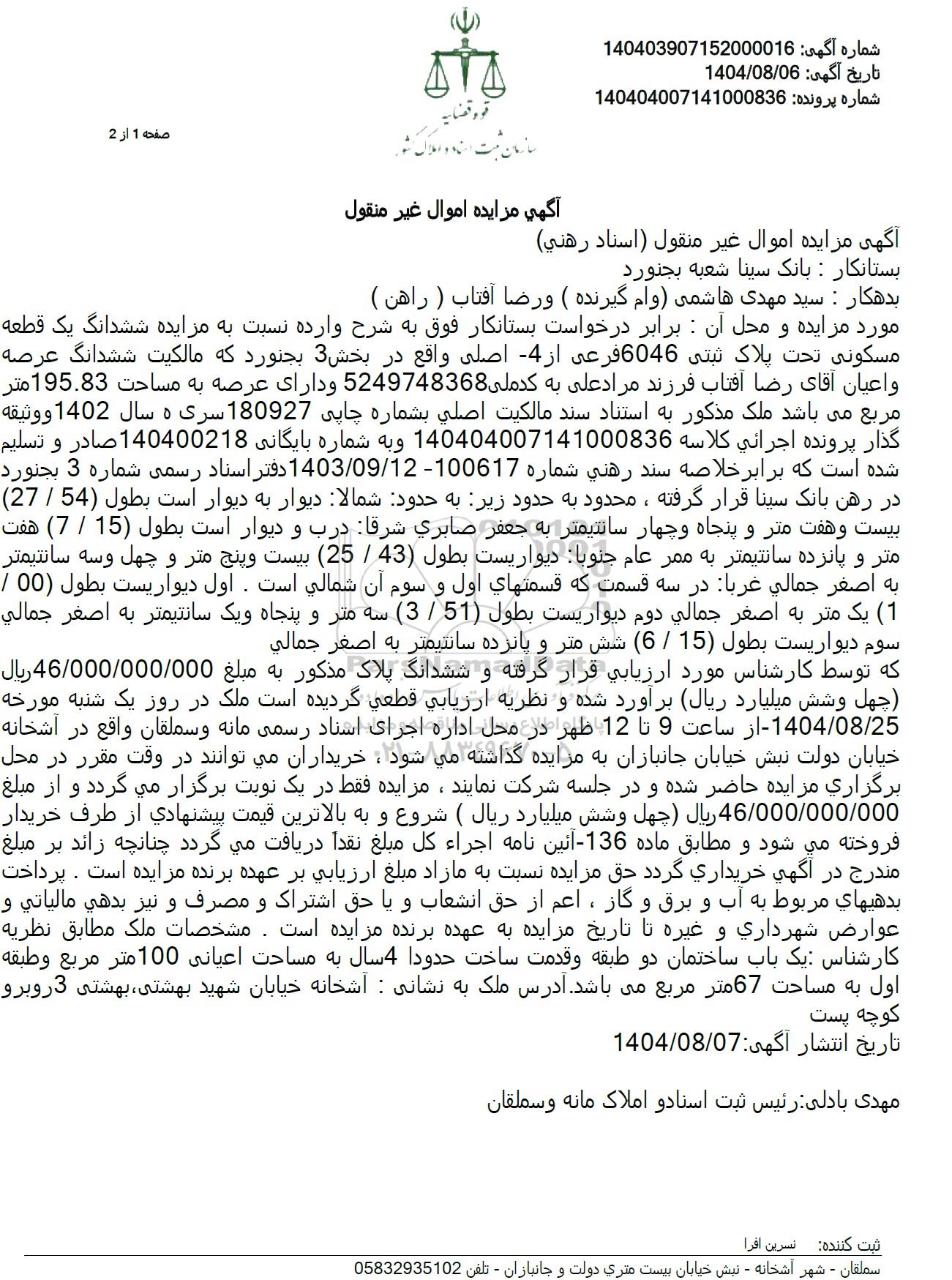 مورد مزایده و محل آن: برابر درخواست بستانکار فوق به شرح وارده نسبت به مزایده ششدانگ یک قطعه مسکونی تحت پلاک ثبتی -6046 فرعی از 4 اصلی واقع در بخش 3 بجنورد که مالکیت ششدانگ عرصه و اعیان آقای رضا آفتاب فرزند مراد علی به کدملی 5249748368 و دارای عرصه به مساحت 195.83 مترمربع میباشد ملک مذکور به استناد سند مالکیت اصلی بشماره چاپی 180927 سری 5 سال 1402 ووثیقه گذار پرونده اجرائی کلاسه 140404007141000836 و به شماره بایگانی 140400218 صادر و تسلیم شده است که برابر خلاصه سند رهنی شماره 100617 - 1403.09.12 دفتر اسناد رسمی شماره 3 بجنورد در رهن بانک سینا قرار گرفته ، محدود به حدود زیر به حدود شمالا دیوار به دیوار است بطول (54 . 27) بیست و هفت متر و پنجاه و چهار سانتیمتر به جعفر صابری شرقا درب و دیوار است بطول (15 . 7) هفت متر و پانزده سانتیمتر به ممر عام جنوبا دیواریست بطول (43) . 25 بیست و پنج متر و چهل و سه سانتیمتر به اصغر جمالی غربا در سه قسمت که قسمتهای اول و سوم آن شمالی است. اول دیواریست بطول 00 .(1) یک متر به اصغر جمالی دوم دیواریست بطول (51) . (3) سه متر و پنجاه و یک سانتیمتر به اصغر جمالی سوم دیواریست بطول (15) . (6) شش متر و پانزده سانتیمتر به اصغر جمالی که توسط کارشناس مورد ارزیابی قرار گرفته و ششدانگ پلاک مذکور به مبلغ 46.000.000.000 ریال چهل و شش میلیارد ریال برآورد شده و نظریه ارزیابی قطعی گردیده است ملک در روز یک شنبه مورخه 1404.08.25 - از ساعت 9 تا 12 ظهر در محل اداره اجرای اسناد رسمی مانه و سملقان واقع در آشخانه خیابان دولت نبش خیابان جانبازان به مزایده گذاشته میشود ، خریداران میتوانند در وقت مقرر در محل برگزاری مزایده حاضر شده و در جلسه شرکت نمایند، مزایده فقط در یک نوبت برگزار می گردد و از مبلغ 46.000.000.000 ریال چهل و شش میلیارد ریال ( شروع و به بالاترین قیمت پیشنهادی از طرف خریدار فروخته می شود و مطابق ماده -136 - آئین نامه اجراء كل مبلغ نقدا دریافت میگردد چنانچه زائد بر مبلغ مندرج در آگهی خریداری گردد حق مزایده نسبت به مازاد مبلغ ارزیابی بر عهده برنده مزایده است . پرداخت بدهیهای مربوط به آب و برق و گاز ، اعم از حق انشعاب و یا حق اشتراک و مصرف و نیز بدهی مالیاتی و عوارض شهرداری و غیره تا تاریخ مزایده به عهده برنده مزایده است. مشخصات ملک مطابق نظریه کارشناس یک باب ساختمان دو طبقه و قدمت ساخت حدودا 4 سال به مساحت اعیانی 100 متر مربع وطبقه اول به مساحت 67 متر مربع میباشد. آدرس ملک به نشانی : آشخانه خیابان شهید بهشتی بهشتی 3 روبرو کوچه پست