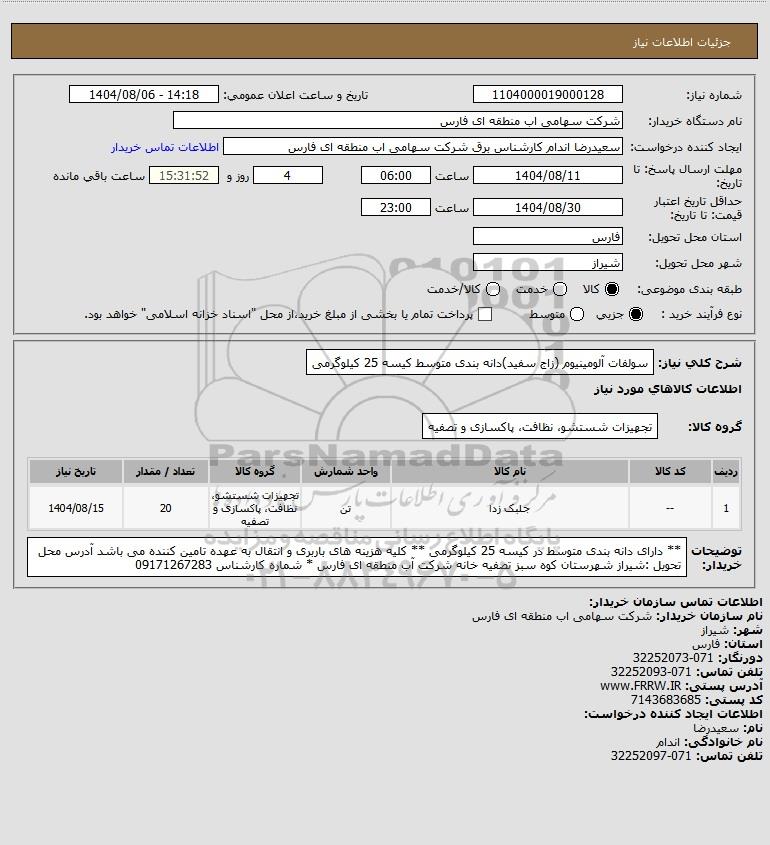 شرح کلی نیاز: سولفات آلومینیوم (زاج سفید)دانه بندی متوسط کیسه 25 کیلوگرمی