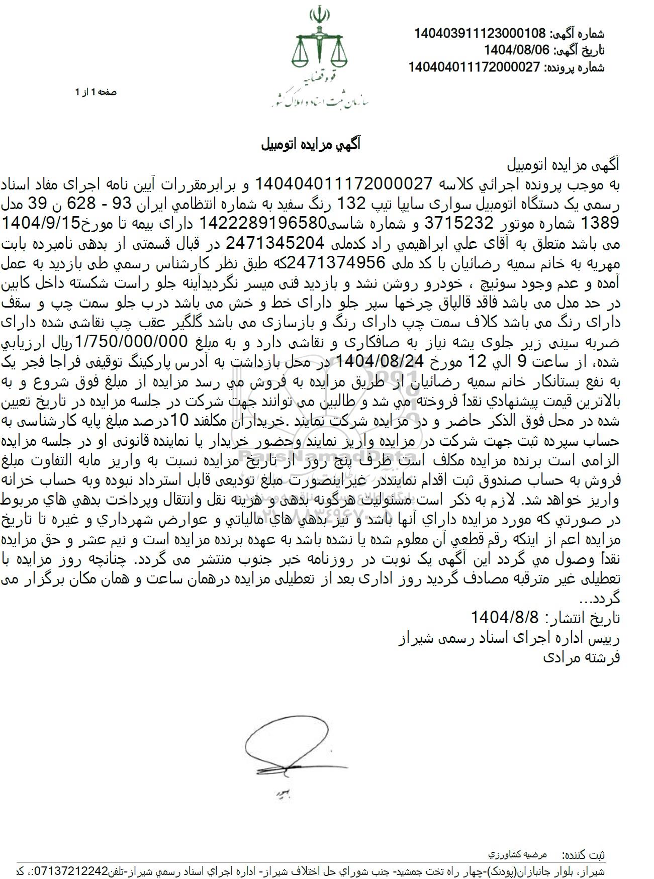 به موجب پرونده اجرائی کلاسه 140404011172000027 و برابر مقررات آیین نامه اجرای مفاد اسناد رسمی یک دستگاه اتومبیل سواری سایپا تیپ 132 رنگ سفید به شماره انتظامی ایران 93 - 628 ن 39 مدل 1404.9.15 1389 شماره موتور 3715232 و شماره شاسی 1422289196580 دارای بیمه تا مورخ می باشد متعلق به آقای علی ابراهیمی راد کدملی 2471345204 در قبال قسمتی از بدهی نامبرده بابت مهریه به خانم سمیه رضائیان با کد ملی 2471374956 که طبق نظر کارشناس رسمی طی بازدید به عمل آمده و عدم وجود سوئیچ ، خودرو روشن نشد و بازدید فنی میسر نگردید اینه جلو راست شکسته داخل کابین در حد مدل میباشد فاقد قالپاق چرخها سپر جلو دارای خط و خش میباشد درب جلو سمت چپ و سقف دارای رنگ میباشد کلاف سمت چپ دارای رنگ و بازسازی میباشد گلگیر عقب چپ نقاشی شده دارای ضربه سینی زیر جلوی پشه نیاز به صافکاری و نقاشی دارد و به مبلغ 1.750.000.000 ریال ارزیابی شده از ساعت 9 الی 12 مورخ 1404.08.24 در محل بازداشت به آدرس پارکینگ توقیفی فراجا فجر یک به نفع بستانکار خانم سمیه رضائیان از طریق مزایده به فروش میرسد مزایده از مبلغ فوق شروع و به بالاترین قیمت پیشنهادی نقداً فروخته میشد و طالبین میتوانند جهت شرکت در جلسه مزایده در تاریخ تعیین شده در محل فوق الذكر حاضر و در مزایده شرکت نمایند خریداران مکلفند 10 درصد مبلغ پایه کارشناسی به حساب سپرده ثبت جهت شرکت در مزایده واریز نمایند و حضور خریدار یا نماینده قانونی او در جلسه مزایده الزامی است برنده مزایده مکلف است ظرف پنج روز از تاریخ مزایده نسبت به واریز مابه التفاوت مبلغ فروش به حساب صندوق ثبت اقدام نمایند در غیر اینصورت مبلغ تودیعی قابل استرداد نبوده و به حساب خزانه واریز خواهد شد. لازم به ذکر است مسئولیت هرگونه بدهی و هزینه نقل و انتقال و پرداخت بدهی های مربوط در صورتی که مورد مزایده دارای آنها باشد و نیز بدهی های مالیاتی و عوارض شهرداری و غیره تا تاریخ مزایده اعم از اینکه رقم قطعی آن معلوم شده یا نشده باشد به عهده برنده مزایده است و نیم عشر و حق مزایده نقدا وصول می گردد این آگهی یک نوبت در روزنامه خبر جنوب منتشر می گردد چنانچه روز مزایده با تعطیلی غیر مترقبه مصادف گردید روز اداری بعد از تعطیلی مزایده در همان ساعت و همان مکان برگزار می گردد.