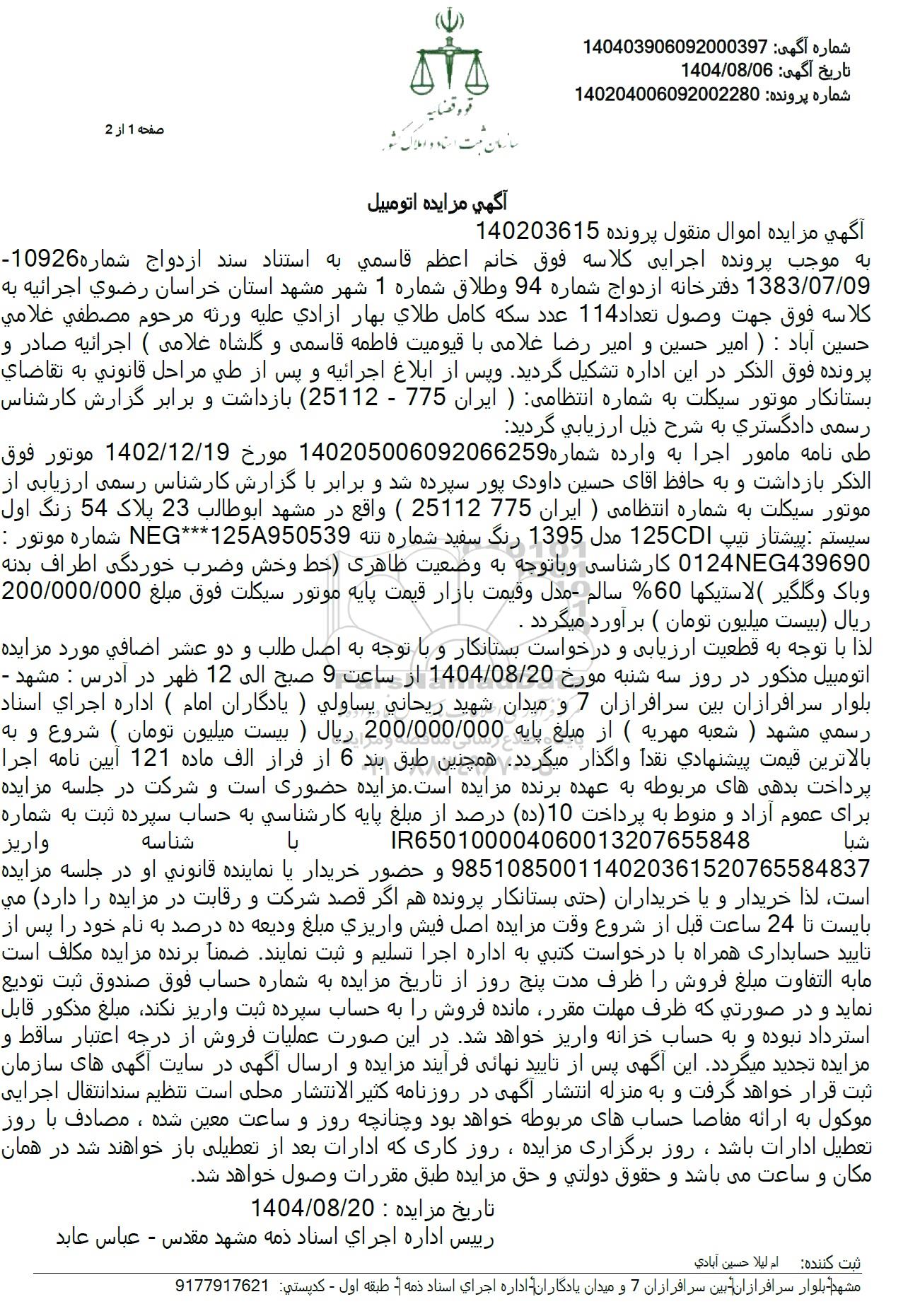 لذا با توجه به قطعیت ارزیابی و درخواست بستانکار و با توجه به اصل طلب و دو عشر اضافی مورد مزایده اتومبیل مذکور در روز سه شنبه مورخ 1404.08.20 از ساعت 9 صبح الی 12 ظهر در آدرس : مشهد -بلوار سرافرازان بین سرافرازان 7 و میدان شهید ریحانی یساولی (یادگاران امام ) اداره اجرای اسناد رسمی مشهد ( شعبه مهریه) از مبلغ پایه 200.000.000 ریال (بیست میلیون تومان ) شروع و به بالاترین قیمت پیشنهادی نقدا واگذار میگردد همچنین طبق بند 6 از فراز الف ماده 121 آیین نامه اجرا پرداخت بدهی های مربوطه به عهده برنده مزایده است. مزایده حضوری است و شرکت در جلسه مزایده برای عموم آزاد و منوط به پرداخت 10 (ده) درصد از مبلغ پایه کارشناسی به حساب سپرده ثبت به شماره شبا IR650100004060013207655848 با شناسه واریز 985108500114020361520765584837 و حضور خریدار یا نماینده قانونی او در جلسه مزایده است، لذا خریدار و یا خریداران (حتی بستانکار پرونده هم اگر قصد شرکت و رقابت در مزایده را دارد) می بایست تا 24 ساعت قبل از شروع وقت مزایده اصل فیش واریزی مبلغ ودیعه ده درصد به نام خود را پس از تایید حسابداری همراه با درخواست کتبی به اداره اجرا تسلیم و ثبت نمایند ضمنا برنده مزایده مکلف است ما به التفاوت مبلغ فروش را ظرف مدت پنج روز از تاریخ مزایده به شماره حساب فوق صندوق ثبت تودیع نماید و در صورتی که ظرف مهلت مقرر مانده فروش را به حساب سپرده ثبت واریز نکند، مبلغ مذکور قابل استرداد نبوده و به حساب خزانه واریز خواهد شد. در این صورت عملیات فروش از درجه اعتبار ساقط و مزایده تجدید میگردد این اگهی پس از تایید نهایی فرایند مزایده و ارسال آگهی در سایت آگهی های سازمان ثبت قرار خواهد گرفت و به منزله انتشار آگهی در روزنامه کثیر الانتشار محلی است تنظیم سند انتقال اجرایی موکول به ارائه مفاصا حسابهای مربوطه خواهد بود و چنانچه روز و ساعت معین شده ، مصادف با روز تعطیل ادارات باشد ، روز برگزاری مزایده، روز کاری که ادارات بعد از تعطیلی باز خواهند شد در همان مکان و ساعت میباشد و حقوق دولتی و حق مزایده طبق مقررات وصول خواهد شد.