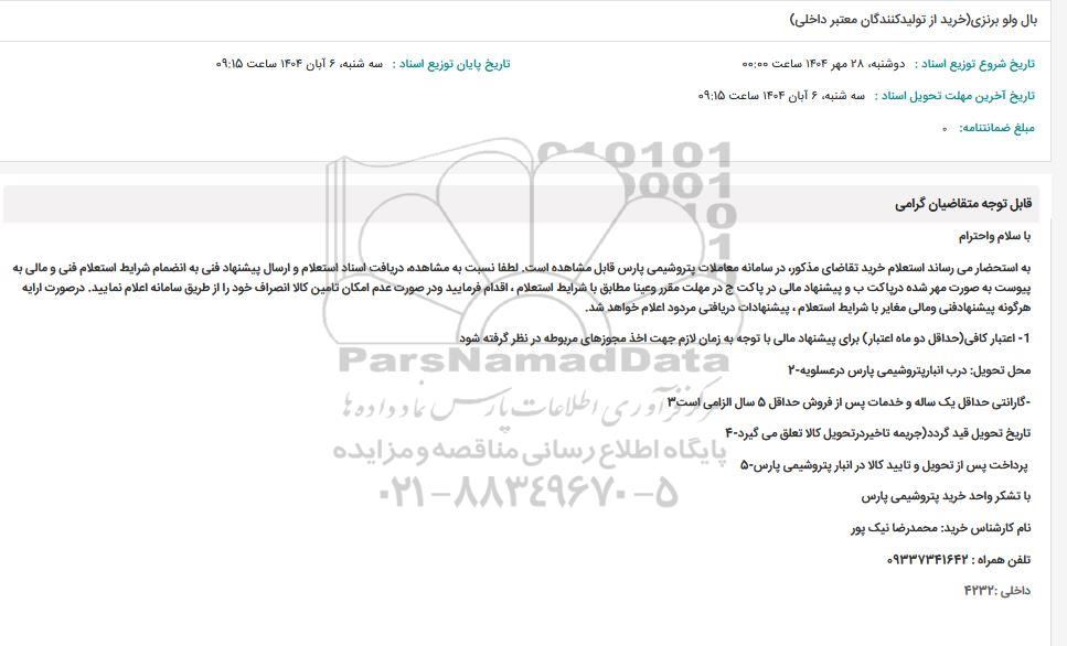 به استحضار میرساند استعلام خرید تقاضای مذکور در سامانه معاملات پتروشیمی پارس قابل مشاهده است. لطفا نسبت به مشاهده دریافت اسناد استعلام و ارسال پیشنهاد فنی به انضمام شرایط استعلام فنی و مالی به پیوست به صورت مهر شده در پاکت ب و پیشنهاد مالی در پاکت ج در مهلت مقرر وعينا مطابق با شرایط استعلام اقدام فرمایید و در صورت عدم امکان تامین کالا انصراف خود را از طریق سامانه اعلام نمایید. در صورت ارایه هرگونه پیشنها دفنی و مالی مغایر با شرایط استعلام پیشنهادات دریافتی مردود اعلام خواهد شد.