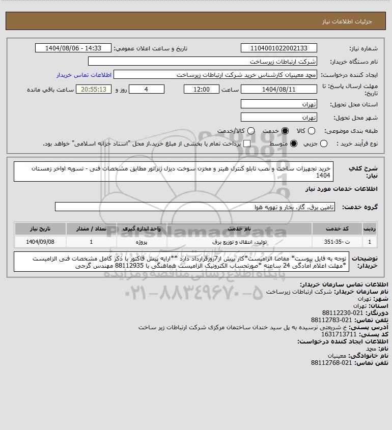 شرح کلی نیاز: خرید تجهیزات ساخت و نصب تابلو کنترل هیتر و مخزن سوخت دیزل ژنراتور مطابق مشخصات فنی - تسویه اواخر زمستان 1404