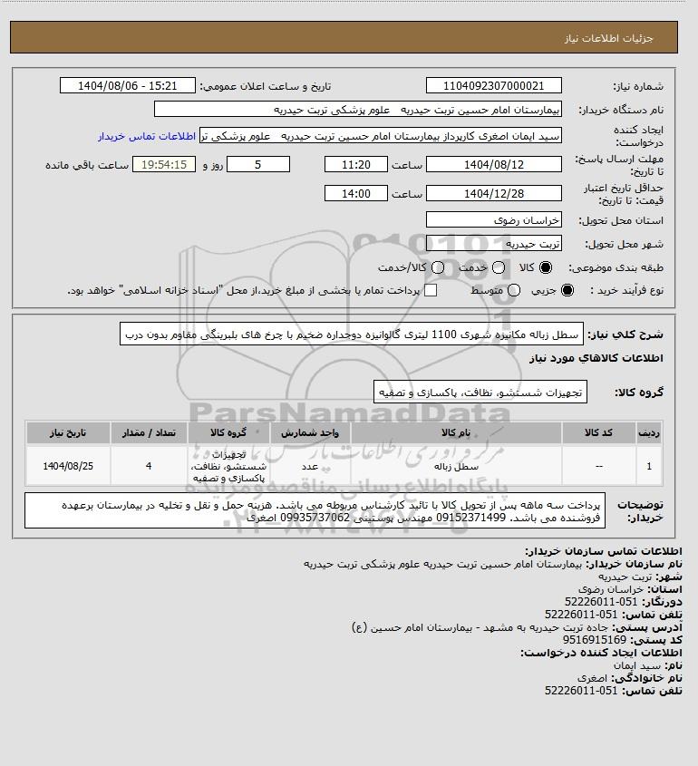 | 1 | -- | سطل زباله | عدد | تجهیزات شستشو، نظافت، پاکسازی و تصفیه | 4 | 1404/08/25 |