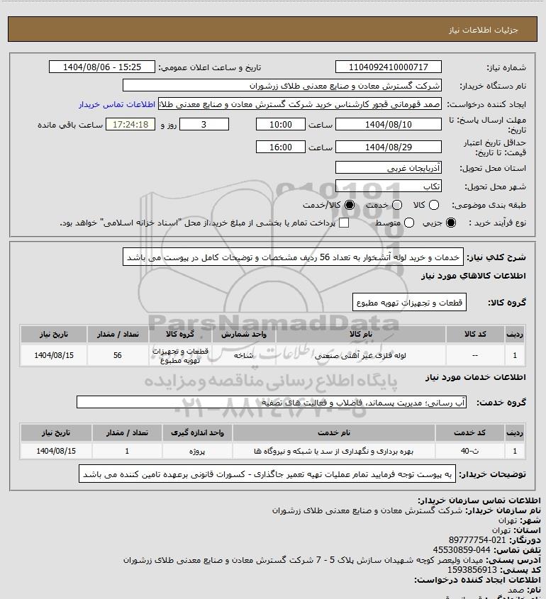 شرح کلی نیاز: خدمات و خرید لوله آتشخوار به تعداد 56 ردیف مشخصات و توضیحات کامل در پیوست می باشد