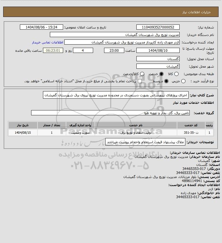 شرح کلی نیاز: اجرای پروژهای نیرورسانی بصورت دستمزدی در محدوده مدیریت توزیع نیروی برق شهرستان گمیشان