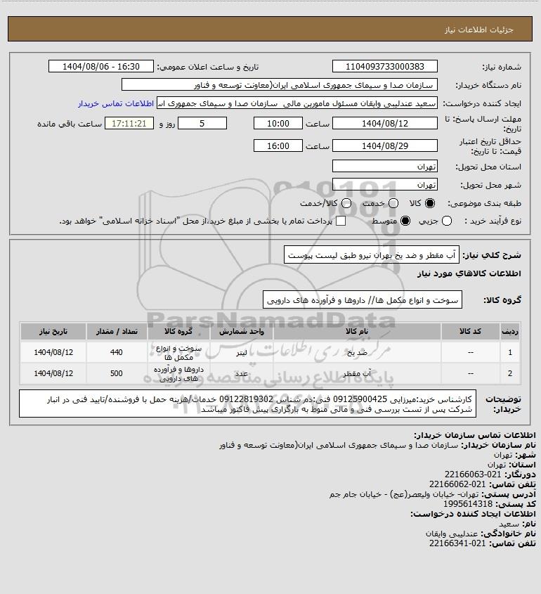 شرح کلی نیاز: آب مقطر و ضد یخ بهران نیرو طبق لیست پیوست