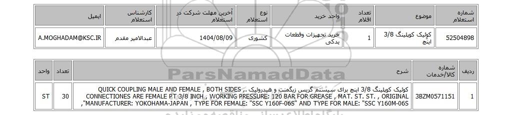 | 52504898 | کوِئیک کوپلینگ 3/8 اینچ | 1 | خرید تجهیزات وقطعات یدکی | کشوری | 1404/08/09 | عبدالامیر مقدم | A.MOGHADAM@KSC.IR |