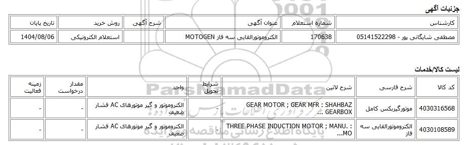| مصطفی شایگانی پور - 05141522298 | 170638 | الکتروموتورالقایی سه فاز MOTOGEN | استعلام الکترونیکی | 1404/08/06 |