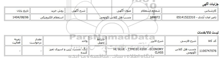 | ناصر امان آبادی - 05141522310 | 169972 | چسب هل کلاس اکونومی | استعلام الکترونیکی | 1404/08/06 |
