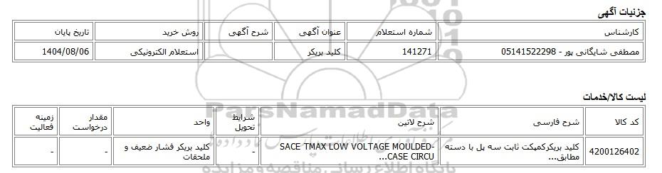 | مصطفی شایگانی پور - 05141522298 | 141271 | کلید بریکر | استعلام الکترونیکی | 1404/08/06 |