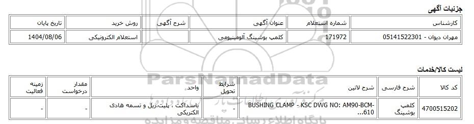 | مهران دیوان - 05141522301 | 171972 | کلمپ بوشینگ آلومینیومی | استعلام الکترونیکی | 1404/08/06 |