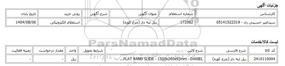 | سیدامیر حسینی راد - 05141522319 | 172082 | ریل لبه دار (چرخ کوره) | استعلام الکترونیکی | 1404/08/06 |
