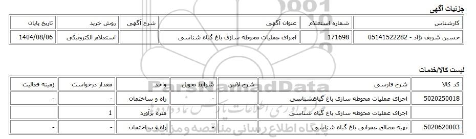 | حسین شریف نژاد - 05141522282 | 171698 | اجرای عملیات محوطه سازی باغ گیاه شناسی | استعلام الکترونیکی | 1404/08/06 |