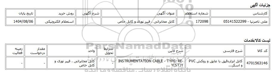 علی ناصرنیا - 05141522299172098کابل مخابراتی ، فیبر نوری و کابل خاصاستعلام الکترونیکی1404/08/06