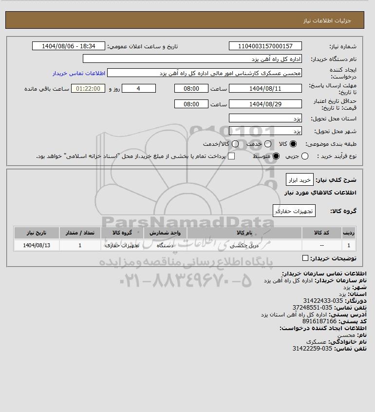 | 1 | -- | دریل چکشی | دستگاه | تجهیزات حفاری | 1 | 1404/08/13 |