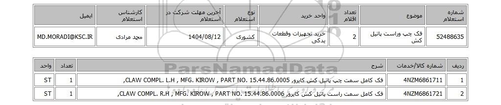 | 2 | 4NZM6861721 | فک کامل سمت راست پاتیل کش کایرو, CLAW COMPL. R.H , MFG. KIROW , PART NO. 15.44.86.0006, | 1 | ST |