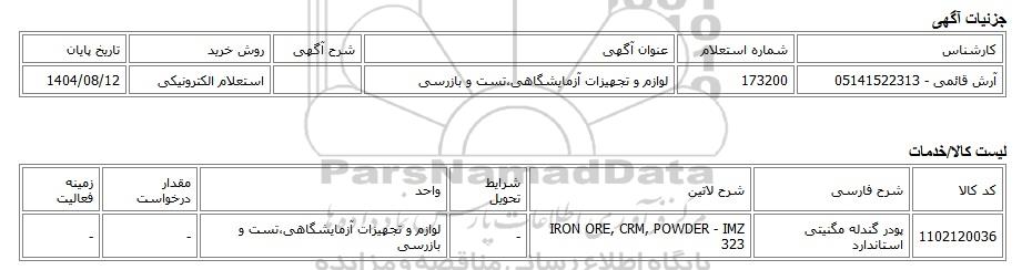 | آرش قائمی - 05141522313 | 173200 | لوازم و تجهیزات آزمایشگاهی،تست و بازرسی | استعلام الکترونیکی | 1404/08/12 |