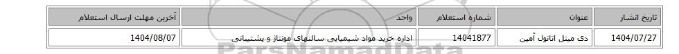 | 1404/07/27 | دی میتل اتانول آمین | 14041877 | اداره خرید مواد شیمیایی سالنهای مونتاژ و پشتیبانی | 1404/08/07 |
