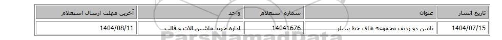 | 1404/07/15 | تامین دو ردیف مجموعه های خط سیلر | 14041676 | اداره خرید ماشین الات و قالب | 1404/08/11 |