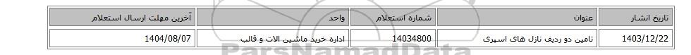 1403/12/22تامین دو ردیف نازل های اسپری14034800اداره خرید ماشین الات و قالب1404/08/07