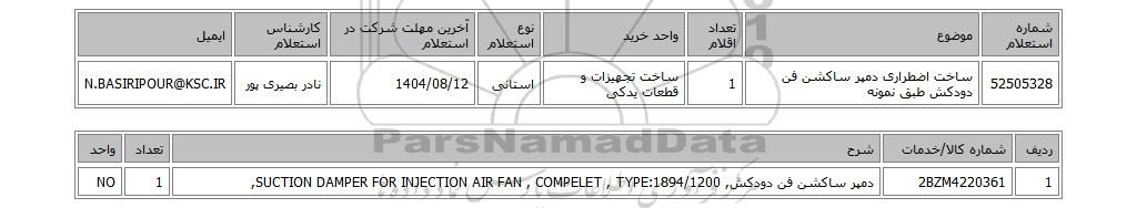 | 52505328 | ساخت اضطراری دمپر ساکشن فن دودکش طبق نمونه | 1 | ساخت تجهیزات و قطعات یدکی | استانی | 1404/08/12 | نادر بصیری پور | N.BASIRIPOUR@KSC.IR |