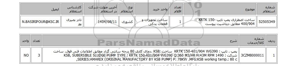 52505349ساخت اضطراری پمپ تایپ KRTK 150-400/904 مطابق دیتاشیت پیوست1ساخت تجهیزات و قطعات یدکیکشوری1404/08/11نادر بصیری پورN.BASIRIPOUR@KSC.IR