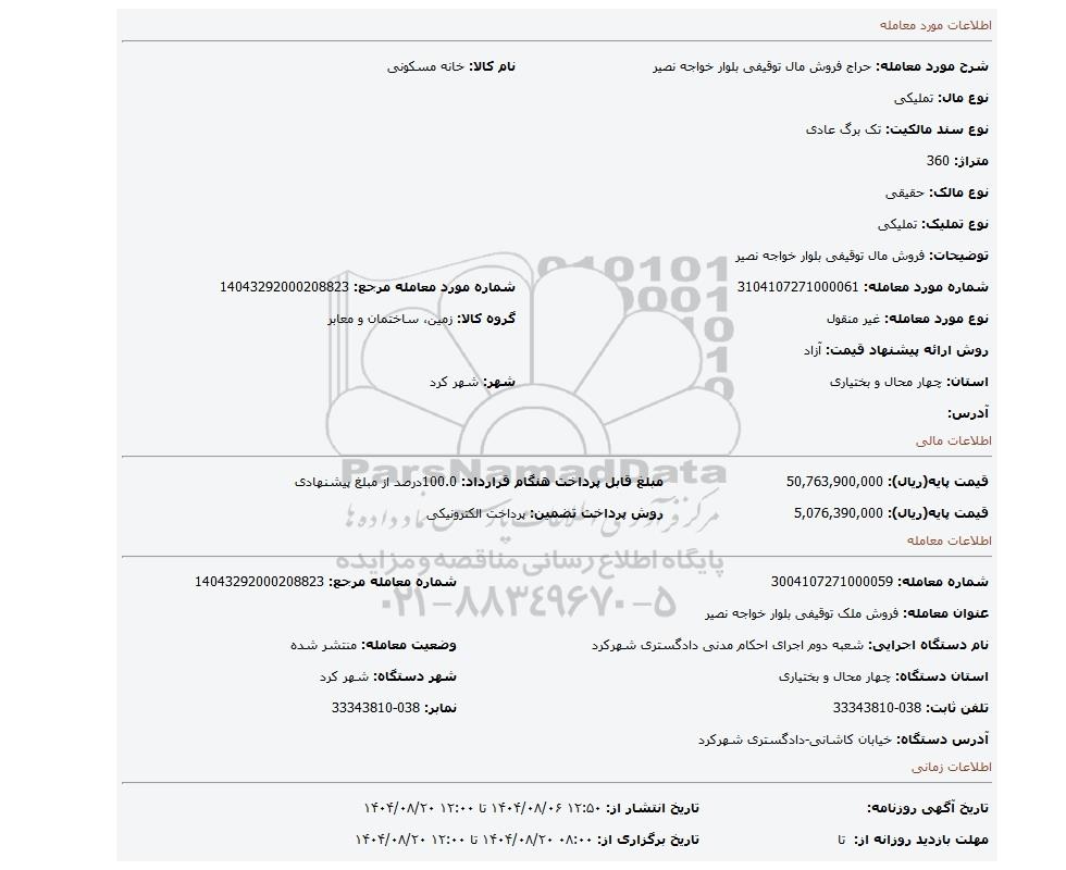 | عنوان معامله: فروش ملک توقیفی بلوار خواجه نصیر | ||