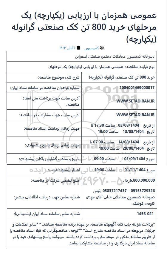 عمومی همزمان با ارزیابی (یکپارچه) یک مرحله ای خرید 800 تن کک صنعتی گرانوله (یکپارچه)
