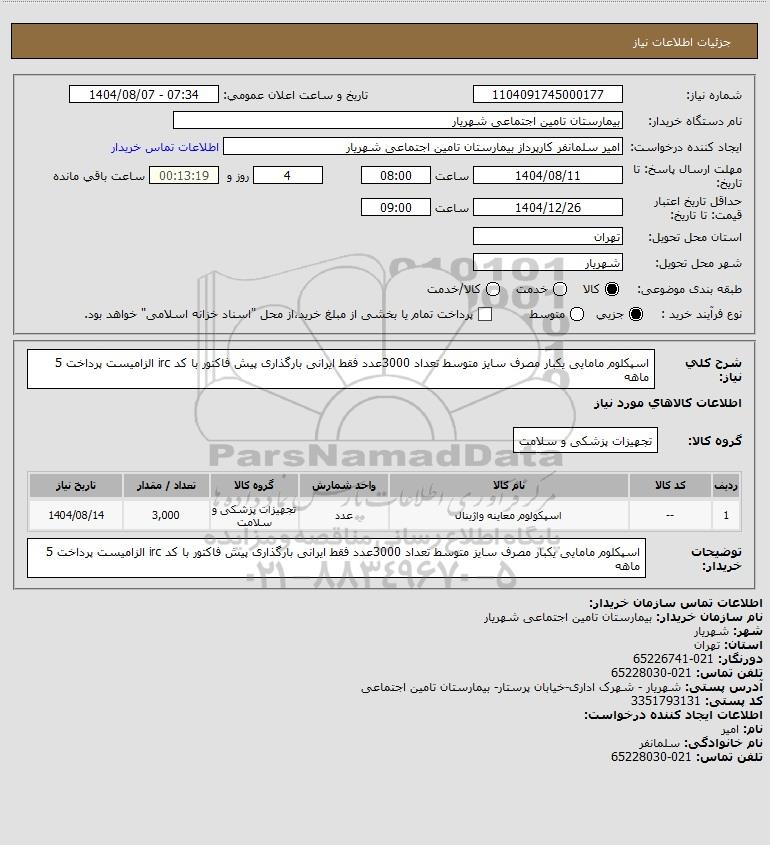 شرح کلی نیاز: اسپکلوم مامایی یکبار مصرف سایز متوسط تعداد 3000عدد فقط ایرانی بارگذاری پیش فاکتور با کد irc الزامیست پرداخت 5 ماهه
