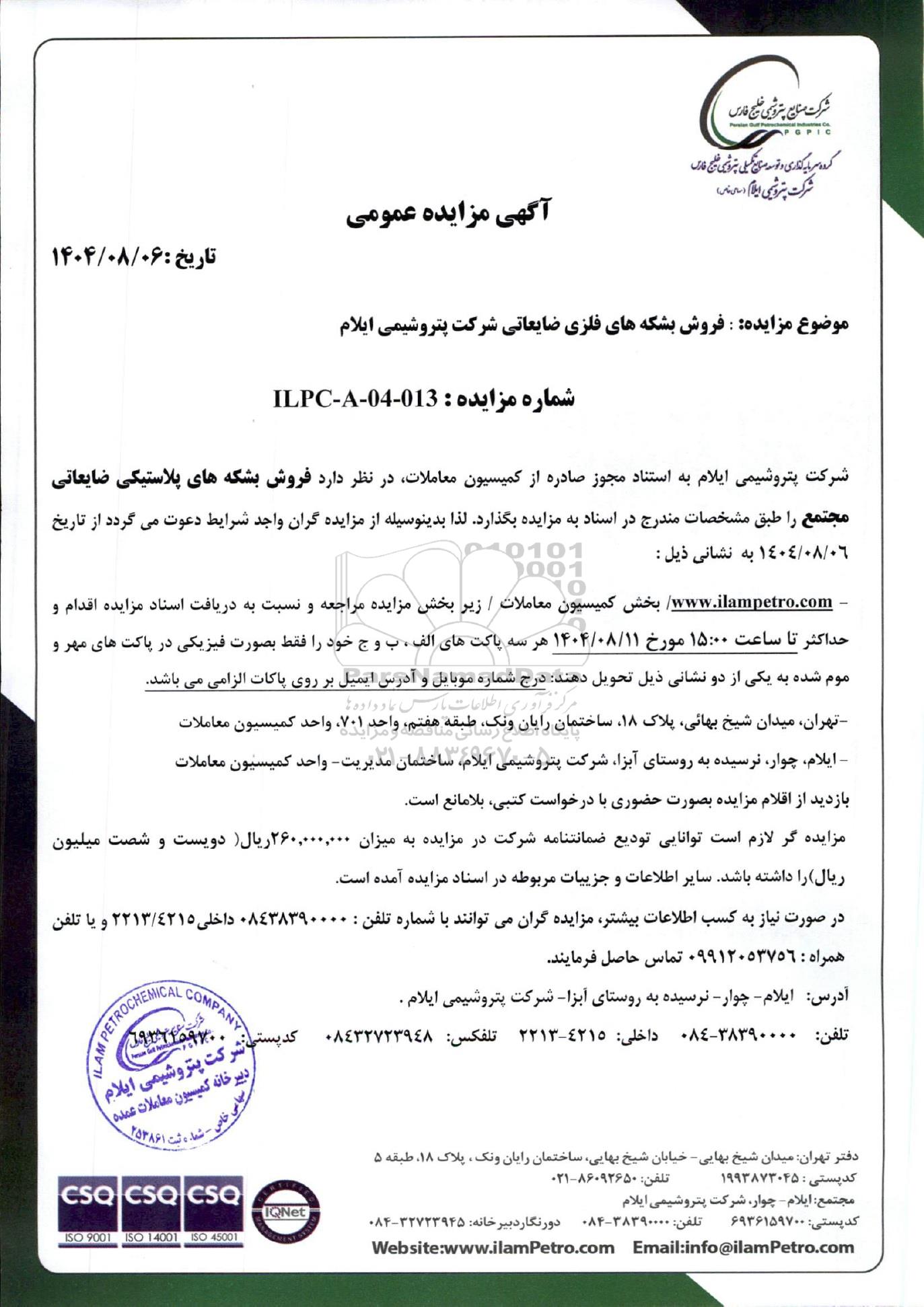 شرکت پتروشیمی ایلام به استناد مجوز صادره از کمیسیون معاملات،در نظردارد فروش بشکه های پلاستیکی ضایعاتی مجتمع را طبق مشخصات مندرج در اسناد به مزایده بگذارد. لذا بدینوسیله از مزایده گران واجد شرایط دعوت می گردد از تاریخ 1404.08.06 به نشانی ذیل :