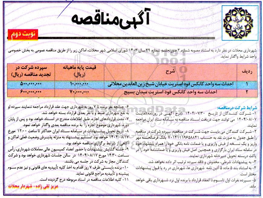 شهرداری محلات در نظر دارد به استناد مصوبه شماره 3 صورتجلسه شماره 39 سال 1403 شورای اسلامی شهر محلات امکان زیر را از طریق مناقصه عمومی به بخش خصوصی واجد شرایط واگذار نماید