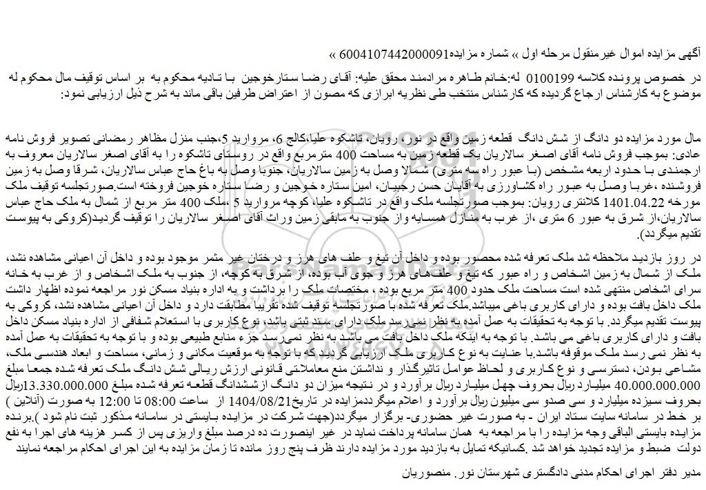 در روز بازدید ملاحظه شد ملک تعرفه شده محصور بوده و داخل آن تیغ و علف های هرز و درختان غیر مثمر موجود بوده و داخل آن اعیانی مشاهده نشد، ملک از شمال به زمین اشخاص و راه عبور که تیغ و علف های هرز و جوی آب بوده، از شرق به کوچه، از جنوب به ملک اشخاص و از غرب به خانه سرای اشخاص منتهی شده است مساحت ملک حدود 400 متر مربع بوده ، مختصات ملک را برداشت و به اداره بنیاد مسکن نور مراجعه نموده اظهار داشت ملک داخل بافت بوده و دارای کاربری باغی میباشد.ملک تعرفه شده با صورتجلسه توقیف شده تقریبا مطابقت دارد و داخل آن اعیانی مشاهده نشد، کروکی به پیوست تقدیم میگردد. با توجه به تحقیقات به عمل آمده به نظر نمی رسد ملک دارای سند ثبتی باشد، نوع کاربری با استعلام شفافی از اداره بنیاد مسکن داخل بافت و دارای کاربری باغی می باشد. با توجه به اینکه ملک داخل بافت می باشد به نظر نمی رسد جزء منابع طبیعی بوده و با توجه به تحقیقات به عمل آمده به نظر نمی رسد ملک موقوفه باشد.با عنایت به نوع کاربری ملک ارزیابی گردید که با توجه به موقعیت مکانی و زمانی، مساحت و ابعاد هندسی ملک، مشاعی بودن، دسترسی و نوع کاربری و لحاظ عوامل تاثیرگذار و نداشتن منع معاملاتی قانونی ارزش ریالی شش دانگ ملک تعرفه شده جمعا مبلغ 40.000.000.000 میلیارد ریال بحروف چهل میلیارد ریال برآورد و در نتیجه میزان دو دانگ ازششدانگ قطعه تعرفه شده مبلغ 13.330.000.000ریال بحروف سیزده میلیارد و سی صدو سی میلیون ریال برآورد و اعلام میگرددمزایده در تاریخ1404/08/21 از ساعت 08:00 تا 12:00 به صورت (آنلاین ) بر خط در سامانه سایت ستاد ایران - به صورت غیر حضوری- برگزار میگردد(جهت شرکت در مزایده بایستی در سامانه مذکور ثبت نام شود ).برنده مزایده بایستی الباقی وجه مزایده را با مراجعه به همان سامانه پرداخت نماید در غیر اینصورت ده درصد مبلغ واریزی پس از کسر هزینه های اجرا به نفع دولت ضبط و مزایده تجدید خواهد شد .کسانیکه تمایل به بازدید مورد مزایده دارند ظرف پنج روز مانده تا زمان مزایده به این اجرای احکام مراجعه نمایند