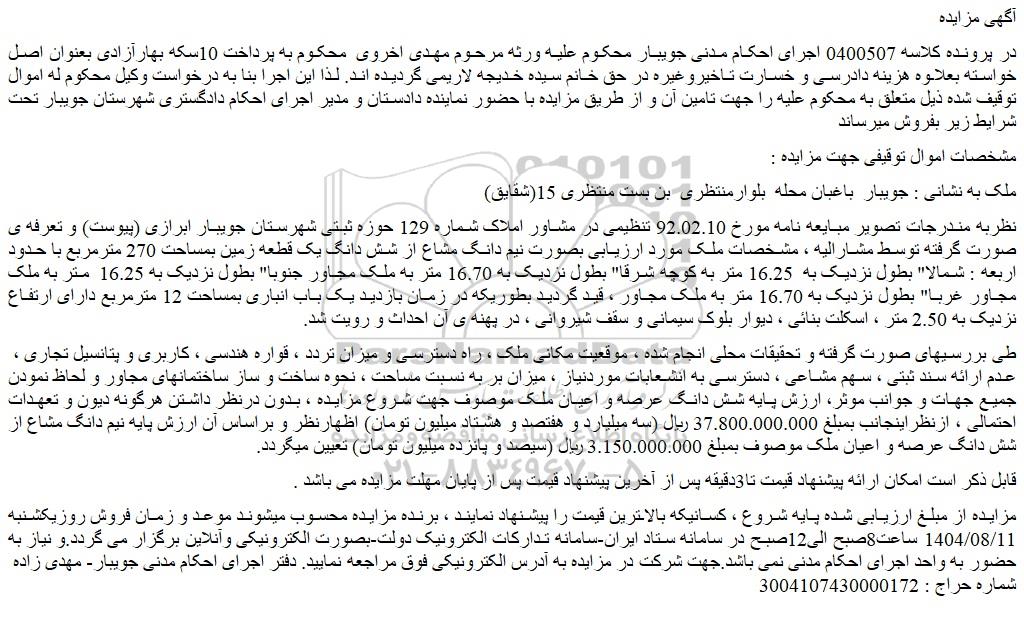در پرونده کلاسه 0400507 اجرای احکام مدنی جویبار محکوم علیه ورثه مرحوم مهدی اخروی محکوم به پرداخت 10سکه بهارآزادی بعنوان اصل خواسته بعلاوه هزینه دادرسی و خسارت تاخیروغیره در حق خانم سیده خدیجه لاریمی گردیده اند. لذا این اجرا بنا به درخواست وکیل محکوم له اموال توقیف شده ذیل متعلق به محکوم علیه را جهت تامین آن و از طریق مزایده با حضور نماینده دادستان و مدیر اجرای احکام دادگستری شهرستان جویبار تحت شرایط زیر بفروش میرساند