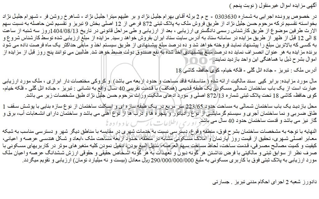 در خصوص پرونده اجرایی به شماره 0303630 - ج م 2 برله آقای بهرام جلیل نژاد و بر علیهم میترا جلیل نژاد - شاهرخ روشن فر - شهرام جلیل نژاد بخواسته تقسیم ترکه مرحوم حسن جلیل نژاد از طریق فروش ملک به پلاک ثبتی 872 فرعی از 12 اصلی بخش 9 تبریز و تقسیم ثمن حاصله به نسبت سهم الارث طرفین موضوع از طریق کارشناس رسمی دادگستری ارزیابی ، بعد از ارزیابی و طی مراحل قانونی در تاریخ 1404/08/13روز سه شنبه از ساعت 8 الی 12 قبل از ظهر از طریق مزایده در سامانه ستاد به آدرس سایت ستاد ایران بفروش خواهد رسید. مزایده از مبلغ ارزیابی شده توسط کارشناس شروع و به کسی که بالاترین مبلغ را پیشنهاد نماید فروخته خواهد شد و ده درصد مبلغ پیشنهادی از طریق سیستم اخذ و مابقی حداکثر یک ماه فرصت داده می شود برنده مزایده به هر عنوان انصراف نماید ده درصد مبلغ پیشنهادی اخذ شده به نفع صندوق دولت ضبط خوهد شد. طالبین می توانند پنج روز قبل از مزایده از اموال بشرح ذیل با هماهنگی این واحد بازدید نمایند.