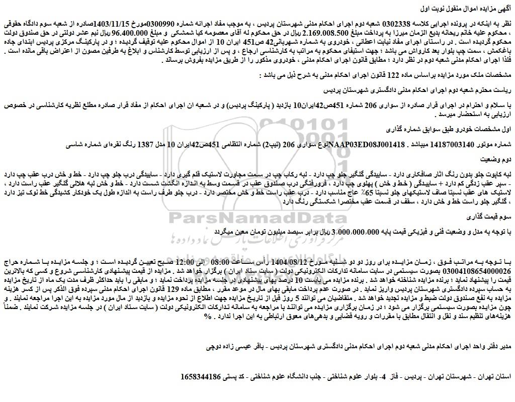 نظر به اینکه در پرونده اجرایی کلاسه 0302338 شعبه دوم اجرای احکام مدنی شهرستان پردیس ، به موجب مفاد اجرائه شماره 0300990مورخ 1403/11/15صادره از شعبه سوم دادگاه حقوقی ، محکوم علیه خانم ریحانه بدیع الزمان میرزا به پرداخت مبلغ 2.169.008.500 ریال در حق محکوم له آقای معصومه کیا شمشکی و مبلغ 96.400.000 ریال نیم عشر دولتی در حق صندوق دولت محکوم گردیده است . در راستای اجرای مفاد نیابت اعطائی ، خودروی به شماره شهربانی42 ص451 ایران 10 از اموال محکوم علیه توقیف گردیده ؛ و در پارکینگ مرکزی پردیس ابتدای جاده باغکمش ، سمت چپ بلوار بعد کارواش می باشد ؛ جهت استیفای محکوم به مراتب به کارشناسی ارجاع ، و پس از ارزیابی توسط کارشناس و ابلاغ به طرفین مصون از اعتراض باقی مانده است . فلذا اجرای احکام مدنی شعبه دوم در نظر دارد ؛ مطابق قانون اجرای احکام مدنی ، خودروی مذکور را از طریق مزایده بفروش برساند .