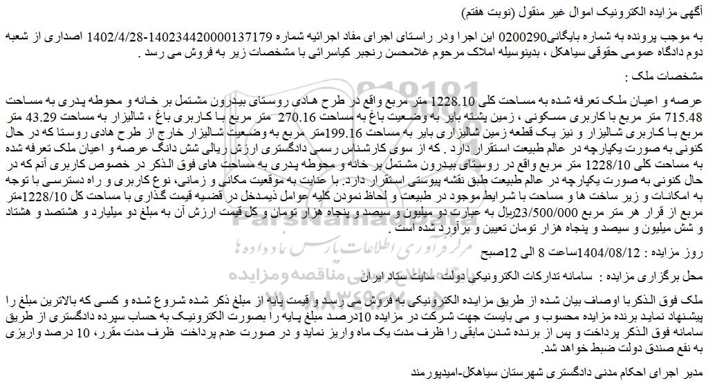 به موجب پرونده به شماره بایگانی0200290 این اجرا ودر راستای اجرای مفاد اجرائیه شماره 140234420000137179-1402/4/28 اصداری از شعبه دوم دادگاه عمومی حقوقی سیاهکل ، بدینوسیله املاک مرحوم غلامحسن رنجبر کیاسرائی با مشخصات زیر به فروش می رسد .