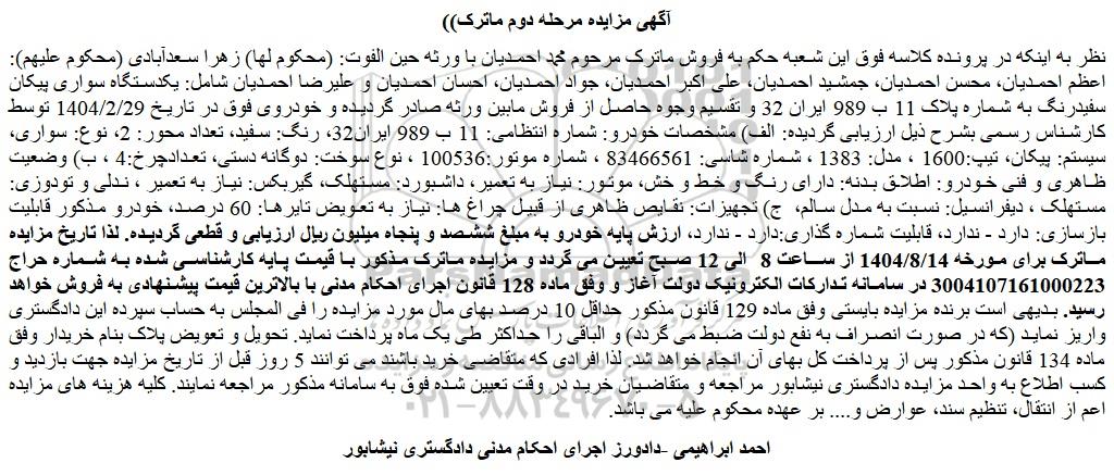 نظر به اینکه در پرونده کلاسه فوق این شعبه حکم به فروش ماترک مرحوم محمد احمدیان با ورثه حین الفوت: (محکوم لها) زهرا سعدآبادی (محکوم علیهم): اعظم احمدیان، محسن احمدیان، جمشید احمدیان، علی اکبر احمدیان، جواد احمدیان، احسان احمدیان و علیرضا احمدیان شامل: یکدستگاه سواری پیکان سفیدرنگ به شماره پلاک 11 ب 989 ایران 32 و تقسیم وجوه حاصل از فروش مابین ورثه صادر گردیده و خودروی فوق در تاریخ 1404/2/29 توسط کارشناس رسمی بشرح ذیل ارزیابی گردیده: الف) مشخصات خودرو: شماره انتظامی: 11 ب 989 ایران32، رنگ: سفید، تعداد محور: 2، نوع: سواری، سیستم: پیکان، تیپ:1600 ، مدل: 1383 ، شماره شاسی: 83466561 ، شماره موتور:100536 ، نوع سوخت: دوگانه دستی، تعدادچرخ:4 ، ب) وضعیت ظاهری و فنی خودرو: اطلاق بدنه: دارای رنگ و خط و خش، موتور: نیاز به تعمیر، داشبورد: مستهلک، گیربکس: نیاز به تعمیر ، ندلی و تودوزی: مستهلک ، دیفرانسیل: نسبت به مدل سالم، ج) تجهیزات: نقایص ظاهری از قبیل چراغ ها: نیاز به تعویض تایرها: 60 درصد، خودرو مذکور قابلیت بازسازی: دارد - ندارد، قابلیت شماره گذاری:دارد - ندارد، ارزش پایه خودرو به مبلغ ششصد و پنجاه میلیون ریال ارزیابی و قطعی گردیده. لذا تاریخ مزایده ماترک برای مورخه 1404/8/14 از ساعت 8 الی 12 صبح تعیین می گردد و مزایده ماترک مذکور با قیمت پایه کارشناسی شده به شماره حراج 3004107161000223 در سامانه تدارکات الکترونیک دولت آغاز و وفق ماده 128 قانون اجرای احکام مدنی با بالاترین قیمت پیشنهادی به فروش خواهد رسید. بدیهی است برنده مزایده بایستی وفق ماده 129 قانون مذکور حداقل 10 درصد بهای مال مورد مزایده را فی المجلس به حساب سپرده این دادگستری واریز نماید (که در صورت انصراف به نفع دولت ضبط می گردد) و الباقی را حداکثر طی یک ماه پرداخت نماید. تحویل و تعویض پلاک بنام خریدار وفق ماده 134 قانون مذکور پس از پرداخت کل بهای آن انجام خواهد شد. لذا افرادی که متقاضی خرید باشند می توانند 5 روز قبل از تاریخ مزایده جهت بازدید و کسب اطلاع به واحد مزایده دادگستری نیشابور مراجعه و متقاضیان خرید در وقت تعیین شده فوق به سامانه مذکور مراجعه نمایند. کلیه هزینه های مزایده اعم از انتقال، تنظیم سند، عوارض و.... بر عهده محکوم علیه می باشد.