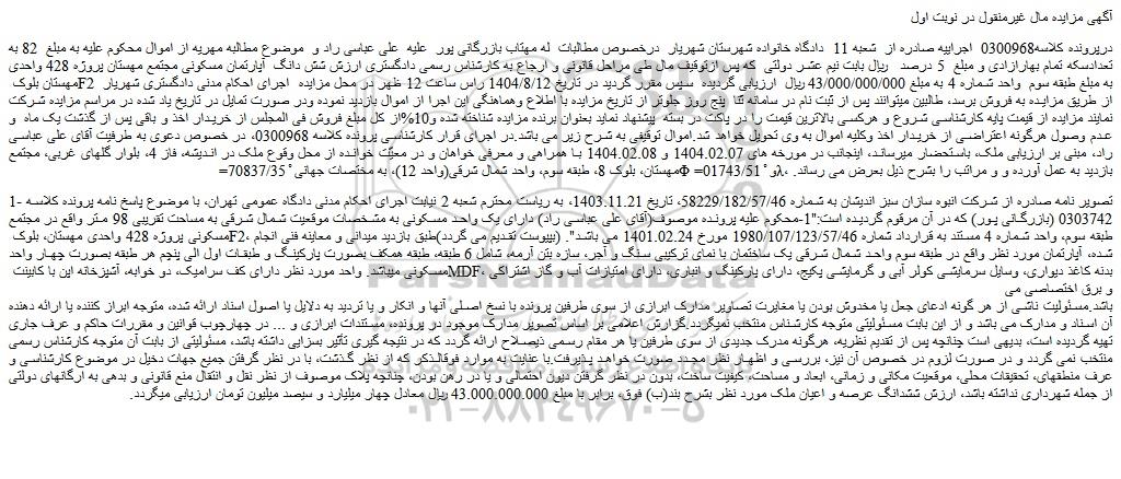 درپرونده کلاسه0300968 اجراییه صادره از شعبه 11 دادگاه خانواده شهرستان شهریار درخصوص مطالبات له مهتاب بازرگانی پور علیه علی عباسی راد و موضوع مطالبه مهریه از اموال محکوم علیه به مبلغ 82 به تعدادسکه تمام بهارازادی و مبلغ 5 درصد ریال بابت نیم عشر دولتی که پس ازتوقیف مال طی مراحل قانونی و ارجاع به کارشناس رسمی دادگستری ارزش شش دانگ آپارتمان مسکونی مجتمع مهستان پروژه 428 واحدی مهستان بلوک f2 به مبلغ طبقه سوم واحد شماره 4 به مبلغ 43/000/000/000 ریال ارزیابی گردیده سپس مقرر گردید در تاریخ 1404/8/12 راس ساعت 12 ظهر در محل مزایده اجرای احکام مدنی دادگستری شهریار از طریق مزایده به فروش برسد، طالبین میتوانند پس از ثبت نام در سامانه ثنا پنج روز جلوتر از تاریخ مزایده با اطلاع وهماهنگی این اجرا از اموال بازدید نموده ودر صورت تمایل در تاریخ یاد شده در مراسم مزایده شرکت نمایند مزایده از قیمت پایه کارشناسی شروع و هرکسی بالاترین قیمت را در پاکت در بسته پیشنهاد نماید بعنوان برنده مزایده شناخته شده و10%از کل مبلغ فروش فی المجلس از خریدار اخذ و باقی پس از گذشت یک ماه و عدم وصول هرگونه اعتراضی از خریدار اخذ وکلیه اموال به وی تحویل خواهد شد.اموال توقیفی به شرح زیر می باشد.در اجرای قرار کارشناسی پرونده کلاسه 0300968، در خصوص دعوی به طرفیت آقای علی عباسی راد، مبنی بر ارزیابی ملک، باستحضار میرساند، اینجانب در مورخه های 1404.02.07 و 1404.02.08 با همراهی و معرفی خواهان و در معیّت خوانده از محل وقوع ملک در اندیشه، فاز 4، بلوار گلهای غربی، مجتمع مهستان، بلوک 8، طبقه سوم، واحد شمال شرقی(واحد 12)، به مختصات جهانی ̊ 70837/35=φ و ̊ 01743/51=λ، بازدید به عمل آورده و و مراتب را بشرح ذیل بعرض می رساند.