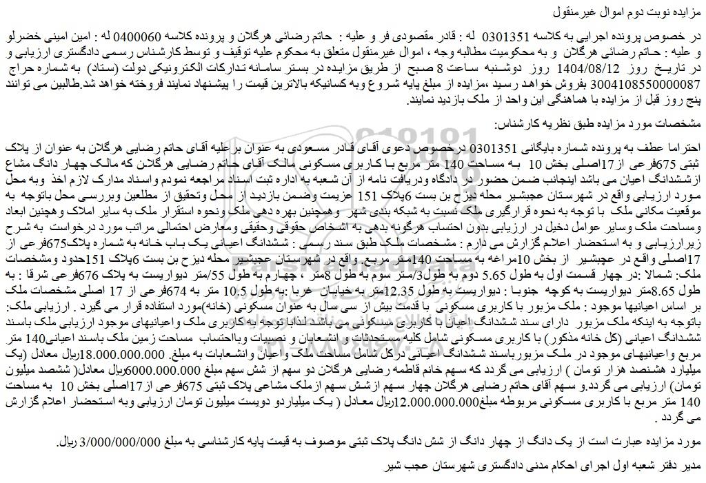 در خصوص پرونده اجرایی به کلاسه 0301351  له : قادر مقصودی فر و علیه :  حاتم رضائی هرگلان و پرونده کلاسه 0400060 له : امین امینی خضرلو و علیه : حاتم رضائی هرگلان  و به محکومیت مطالبه وجه ، اموال غیرمنقول متعلق به محکوم علیه توقیف و توسط کارشناس رسمی دادگستری ارزیابی و در تاریخ  روز  1404/08/12  روز  دوشنبه  ساعت 8 صبح  از طریق مزایده در بستر سامانه تدارکات الکترونیکی دولت (ستاد)  به شماره حراج  3004108550000087 بفروش خواهد رسید ،مزایده از مبلغ پایه شروع وبه کسانیکه بالاترین قیمت را پیشنهاد نمایند فروخته خواهد شد.طالبین می توانند پنج روز قبل از مزایده با هماهنگی این واحد از ملک بازدید نمایند.