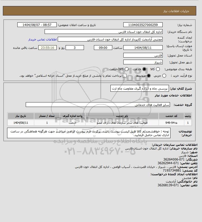 شرح کلی نیاز: بررسی چاه و اندازه گیری مقاومت چاه ارت