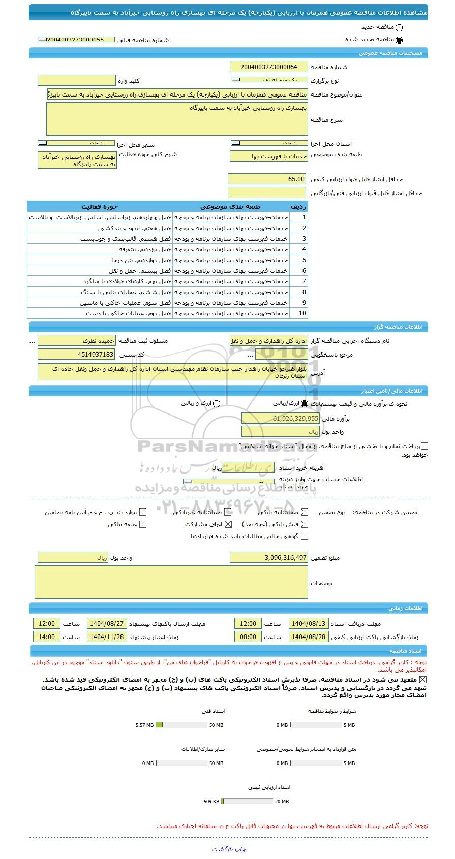 | شرح مناقصه | بهسازی راه روستایی خیرآباد به سمت پاییزگاه | |||||||||||||||||||||||||||||||||||