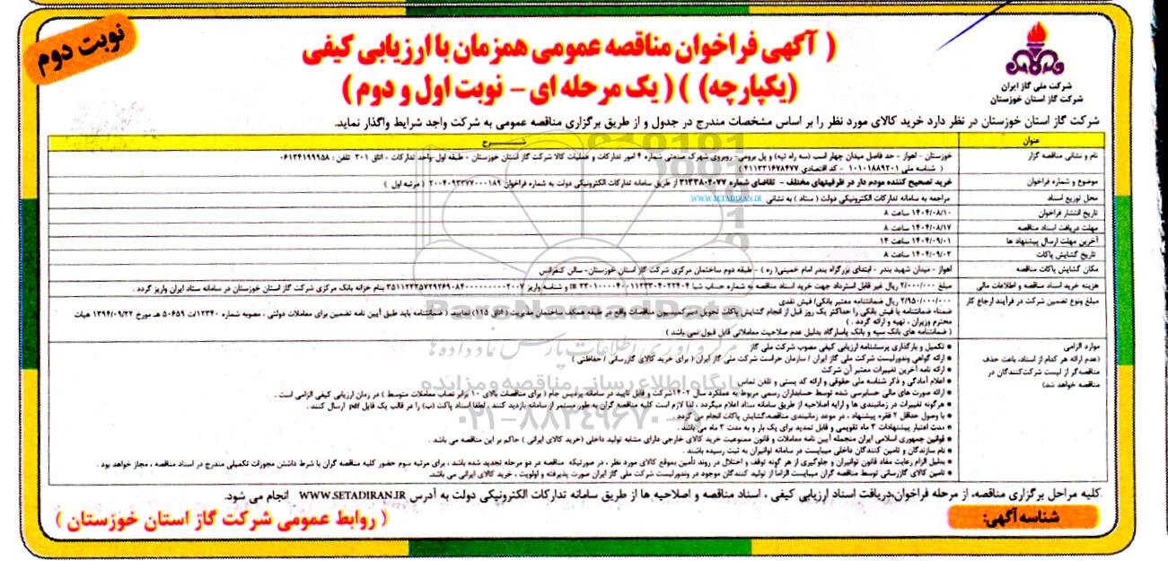 شرکت گاز استان خوزستان در نظر دارد خرید کالای مورد نظر را بر اساس مشخصات مندرج در جدول و از طریق برگزاری مناقصه عمومی به شرکت واجد شرایط واگذار نماید.