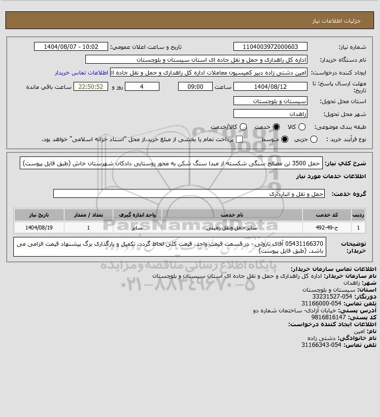 شرح کلی نیاز: حمل 3500 تن مصالح سنگی شکسته از مبدا سنگ شکن به محور روستایی دادکان شهرستان خاش (طبق فایل پیوست)
