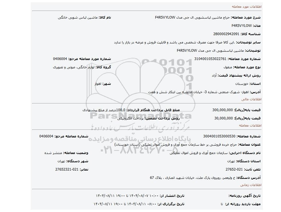 | نام دستگاه اجرایی: سازمان جمع آوری و فروش اموال تملیکی | وضعیت معامله: منتشر شده | |