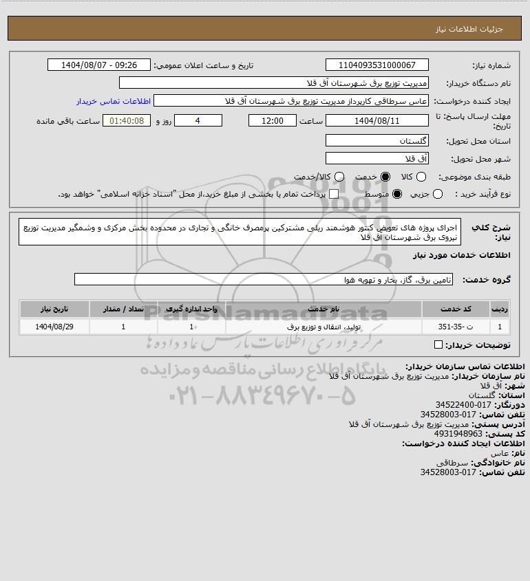 شرح کلی نیاز: اجرای پروژه های تعویض کنتور هوشمند ریلی مشترکین پرمصرف خانگی و تجاری در محدوده بخش مرکزی و وشمگیر مدیریت توزیع نیروی برق شهرستان آق قلا