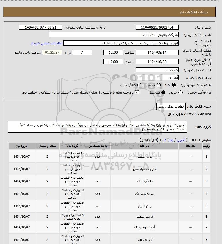 | 5 | -- | چرخ ایمپلر | عدد | تجهیزات و قطعات حوزه تولید و ساخت | 2 | 1404/10/07 |